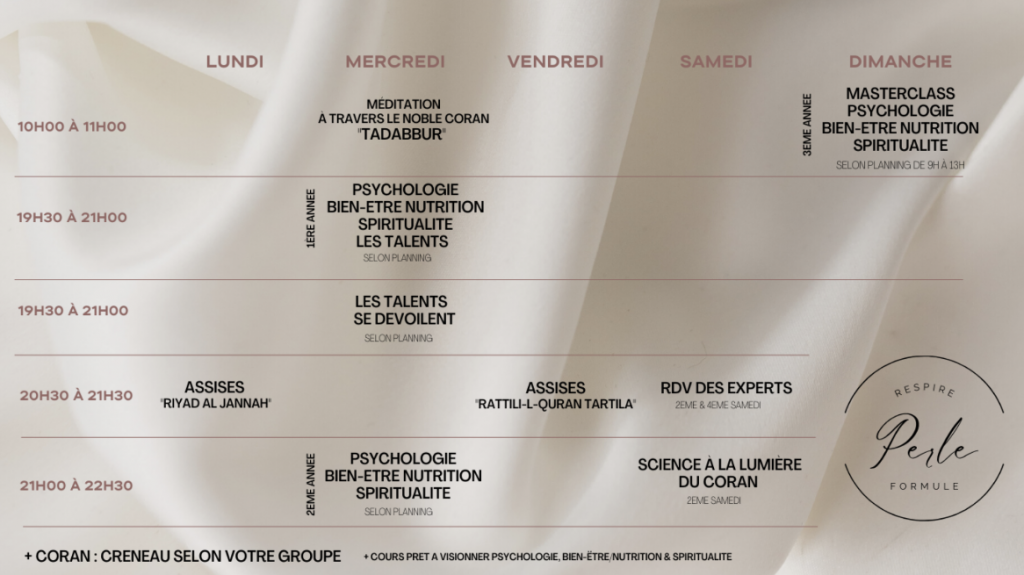Perfectionnement des piliers de la prière, purification, explication des termes utilisés durant la prière, la concentration, le recueillement… Voyagez à travers le Saint Coran Science du Coran, circonstances de révélations, étude de passages Coraniques en compagnie du Noble Prophète Mohamed et étude de sa vie et des événements principaux. Un cours en direct par mois et des nouveaux cours disponible chaque début de mois à visionner selon vos envies !